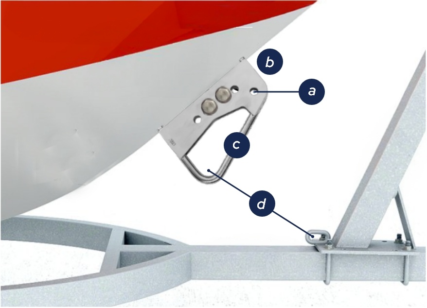 Image Key: (a) Hole for shackle for the winch hook. (b) Best Roller position for ‘wedging’ the boat. (c) The ‘Latched’ boat should be held about here. The point the Latch first hits should be about here. Allow for ‘kick-up’ as it approaches if you ‘gun’ it too hard. (d) Safety chain attaches here.
